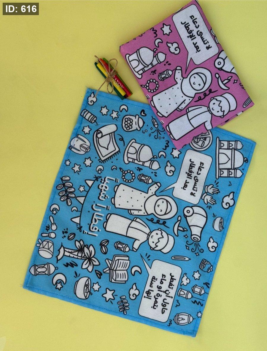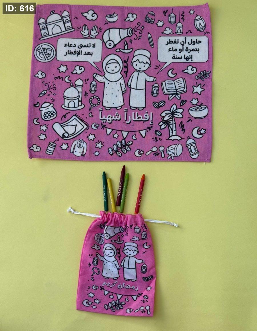 مفرش يوضع تحت الطبق في رمضان يلونه الطفل اثناء انتظار الاذان .. مع ملاحظات مكتوبة على المفرش لتذكير الطفل بدعاء الافطار وسنن الافطار